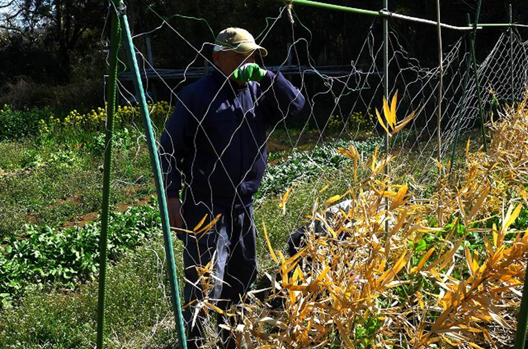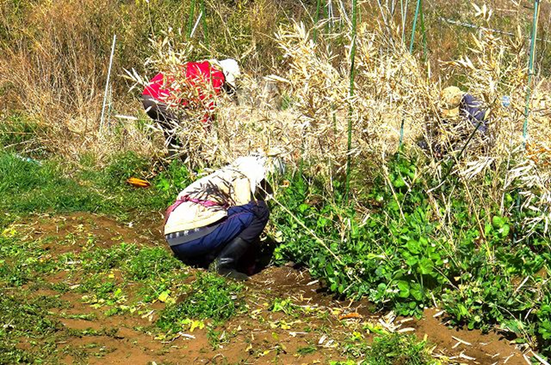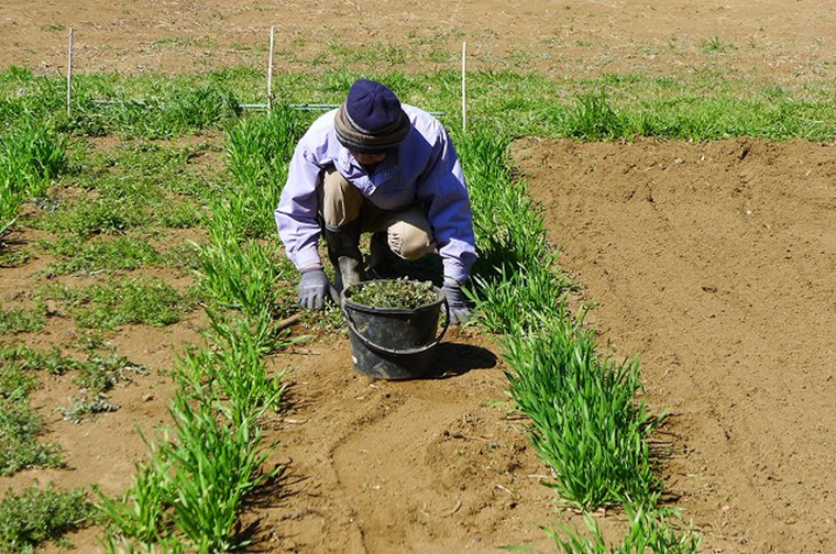 12区 エンドウ類蔓用網立、草取り、ネギ苗地管理作業