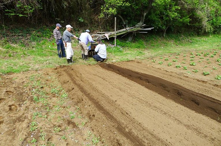 前畑 ヤマトイモ植付準備(畝立て2畝・植溝作り)、ジャガイモ芽かき、畑地周辺草刈り