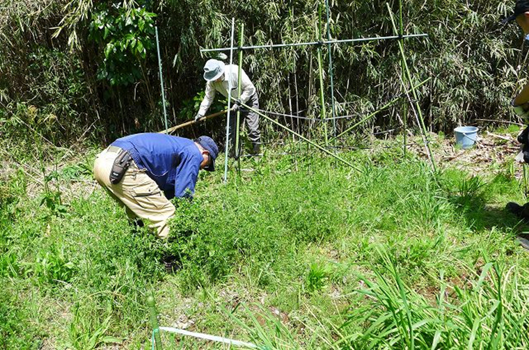 新緑が美しい里山のもとで、20名の参加者は汗ばみながら作業を行いました。午後は地主さんの山で竹林整備を行い、タケノコを慣れた手順で掘り上げ、季節の行事を楽しみました。