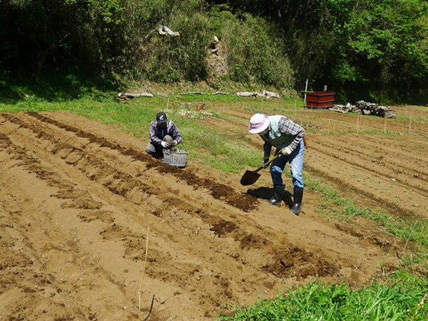 山里は日本の原風景があり、人と自然が共生し安らぎを与えてくれる場所でもあります。参加者はこのような環境のなかで、マイペースで農作業をして癒されています。4月20日より横浜市に「まん延防止等重点措置」が適用されましたが、本日は20名が分散して野菜の種蒔きと定植の準備、土寄せ、消毒など多岐にわたり農作業をしました。昼食後は竹林整備を行い、汗をかきました。
