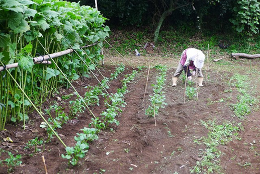 大根、ルッコラ生育良好、枝豆害虫被害でやや心配、ソバ畑はミツバチが受粉のため乱舞