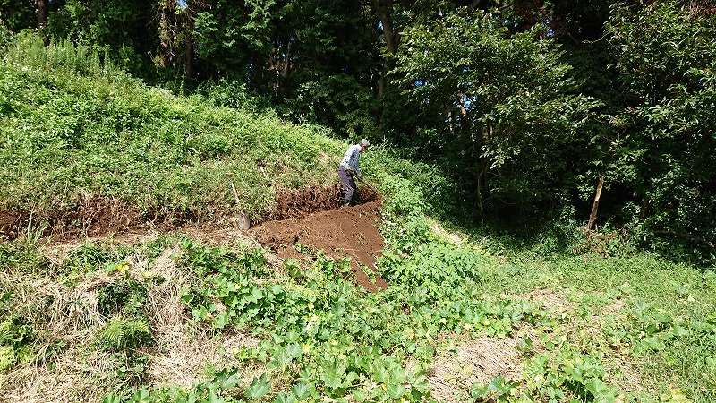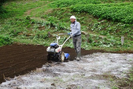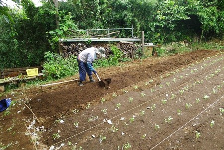・前畑:秋ジャガイモの草取り・芽欠き、ソラマメ用予定地に石灰散布・耕耘