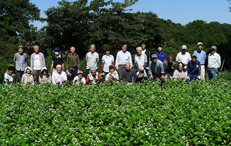 このところはっきりしない週末が続きましたが、今日はさわやかな秋晴れになりました。24℃と爽やかな気候のもと、26名が参加して農作業を楽しみました。きれいに咲いたソバの白い花畑の前で参加者全員の写真を撮りましたが、コロナ以降はイベントを中止していたので、集合写真は3年ぶりかもしれません。