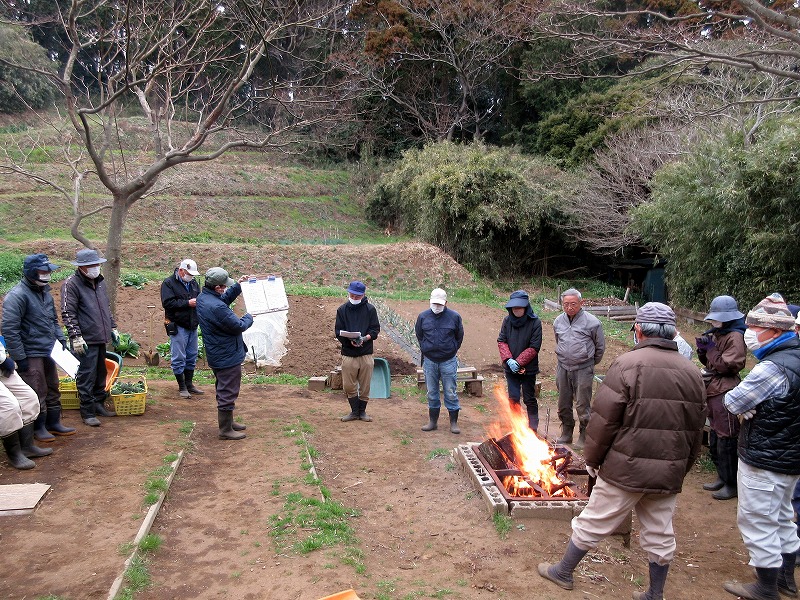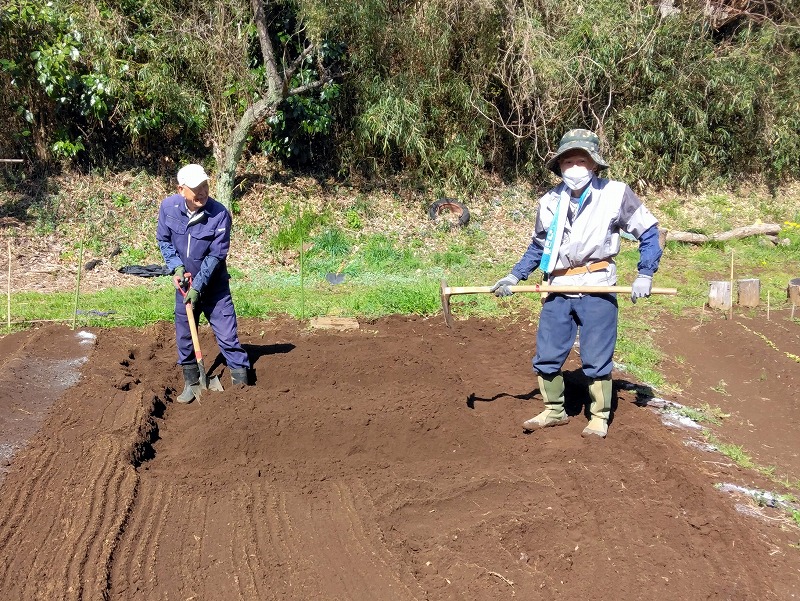 今日は春本番の陽気になり、ウグイスやコジュケイが気持ちよさそうにさえずる中、20名の会員が春野菜の植え付けなど畑作業を行いました。前日の雨で畑は乾燥状態からたっぷり水を含み湿潤状態になり、水不足で作業が遅れていた堆肥づくりの切り替えしも一気に進みました。