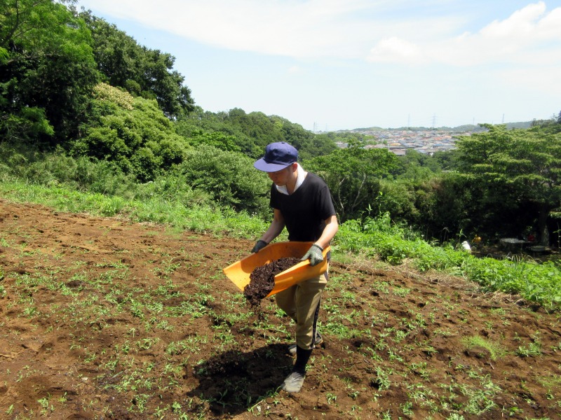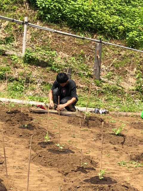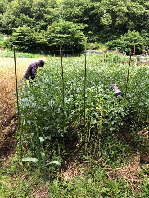 今日は朝から蒸し暑く、参加者19名と家族1名は熱中症に気をつけて作業をしました。降雨や先週の麦刈りなどで遅れ気味になっていた苗の植付けや雑草取りなどの作業を、多少は挽回することが出来ました。収穫したジャガイモやタマネギなどは大きめで量も多く、初収穫のミニトマトが花を添えました。