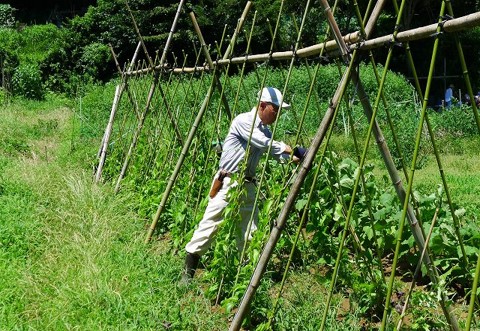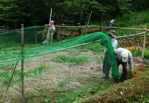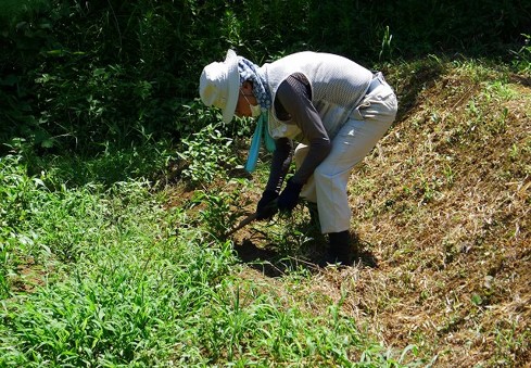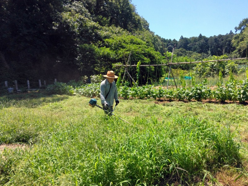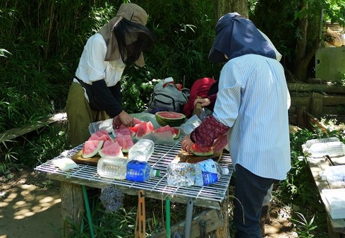 今日も雲一つない青空でギラギラと真夏の太陽が照り付けます。ミニトマトは毎週食べきれないほどの収穫で、スイカも大きくなっており、雨が無くても青々と育つ野菜の生命力に感心します。21名が参加し、熱中症予防と午後作業があるため11時昼食としました。畑のスイカの初試食会があり、ひんやりとした美味しさにしばし炎熱地獄から解放されました。電気柵のお陰で獣害もなく、今年は沢山の大きなスイカを堪能できそうです。