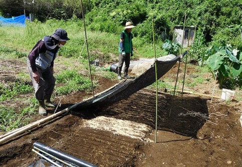 ・前畑 ゴーヤ畑上げ、ヤーコン管理、サツマイモ蔓整理。
