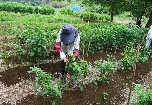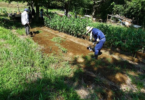 朝は蒸し暑い曇天でしたが、晴れてきて、引き続き酷暑の1日となりました。19名の会員と家族1名が参加し、この時期の野菜の収穫と秋冬野菜の準備に汗を流しました。