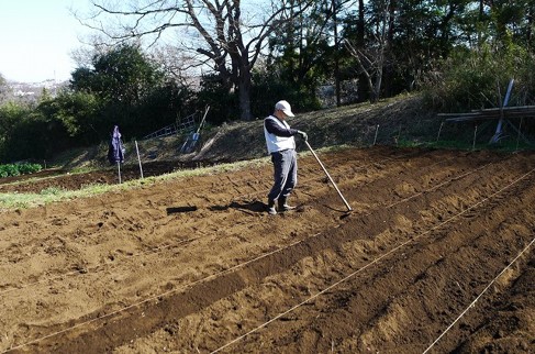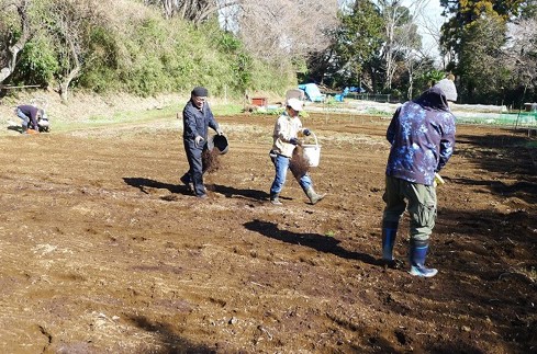 ・5区 エンドウ蔓用網掛け、ホウレンソウ等葉物用地種蒔準備(施肥、耕耘)