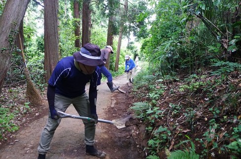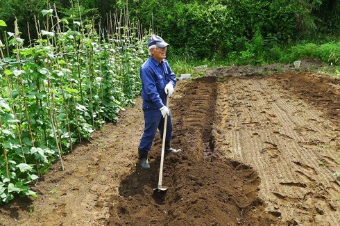 定例日が雨で26日(水)に振替作業を行いましたが、空気が肌にべたつくほどの湿度が高い日でした。気温は30℃を下回ったものの、熱中症予防のため一斉休憩を午前で2回取りました。8人と少ないわりにはスイカの管理作業をはじめ、おおくぼの予定の仕事が半分近くできたので達成感はありました。午後の草取りの作業もがんばりました。