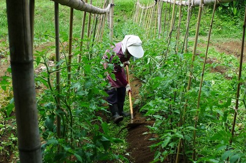 5区 ナス管理作業(芽欠き・支柱への枝止め・畝間刈草ナスの敷き込み)、ミニトマト管理作業、