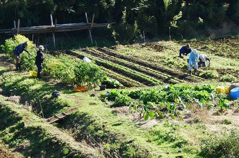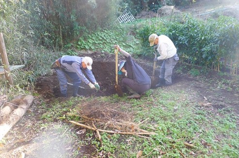 朝は冷え込み、朝礼は焚き火を囲んで行いましたが、作業中は快晴で日差しが暖かく、また昼食後には雲が出てきて冷え込むという、日差しの暖かさを痛感した1日でした。19名の会員が参加して野菜の管理作業や枯草焼却、駐車場清掃などを行い、お昼には餅入りお汁粉やミカンが振舞われ、注連飾りを各所の入口に飾って畑納めとしました。新年は1月5日が畑開きです。