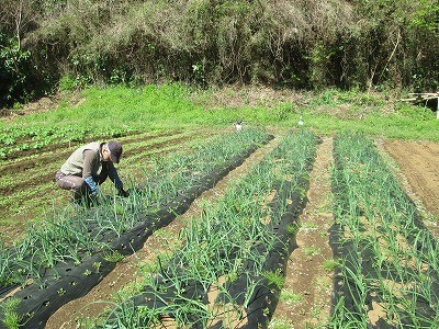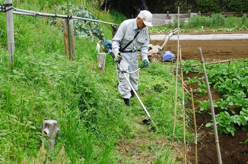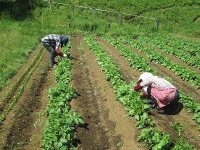 前畑 ジャガイモ畑草取り・追肥・土寄せ、畑周辺草刈り・刈草寄せ