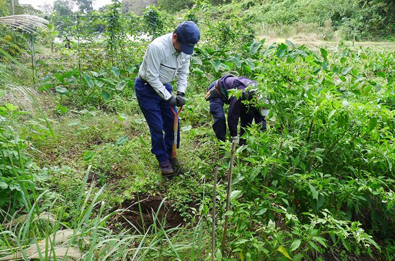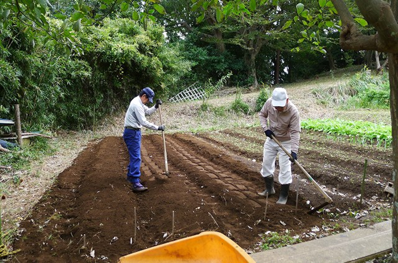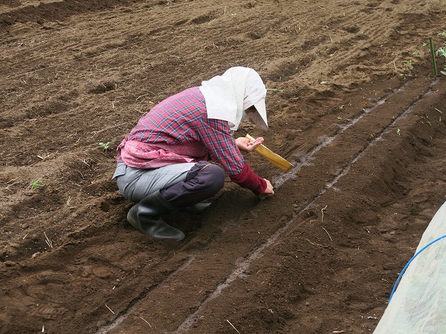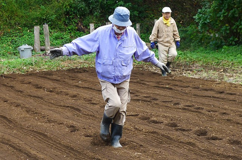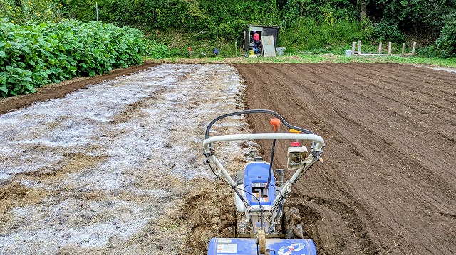 4区 種蒔準備(牛糞・化成肥料散布耕耘、畝立て)城ヶ島ソラマメ種蒔(2畝 約150粒)