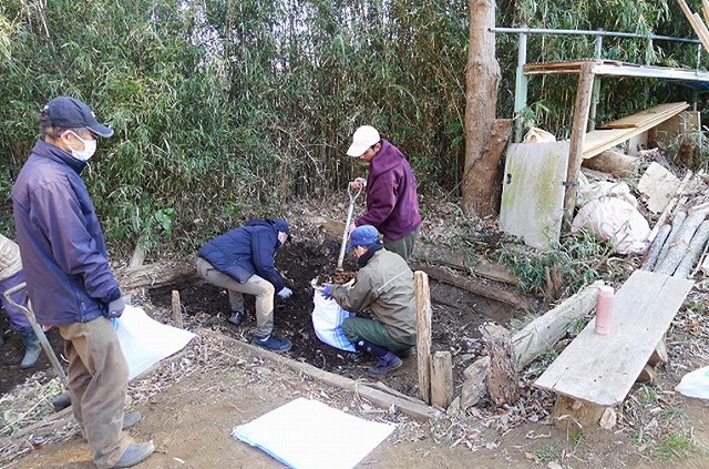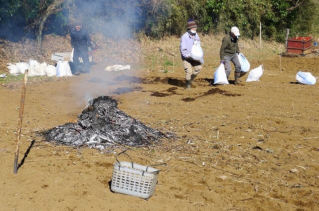 朝は寒かったですが快晴で次第に暖かくなり、15名が参加して作業は順調に進みました。堆肥T1とT3の堆肥を頑張って袋詰にして50袋以上を前畑に運びました。しかし、1か月以上日照りが続いて天水の蓄えが無くなり、新しい堆肥づくりがストップしてしまいました。雨が降るよう雨乞いが必要になってきました。