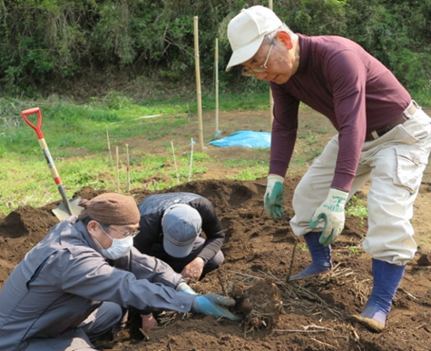 ●作業内容: トマト植付準備 、 蔓なしインゲン・ダイコン種蒔き、コマツナ・ホーレンソウ種蒔き 、 シュンギク・ナバナ畑上げ・整地・耕耘 、 ヤマトイモ植付準備、 ソラマメ倒伏防止用支柱建て 、落葉堆肥場管理、草取り、枯れ草木等消却 、 上段トイレの改修